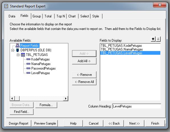 Karena kita akan membuat Laporan Petugas maka pilih TBL_PETUGAS